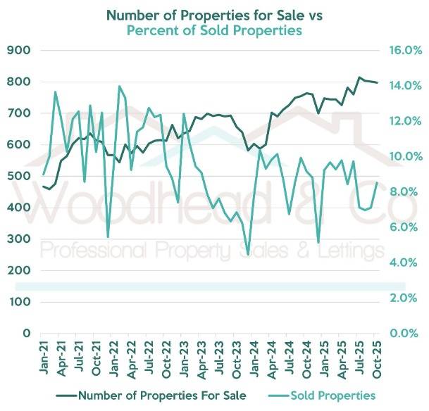 A total of 68 sales were agreed, up 19 % on September, while total listings held steady at 798. The average time to sell fell to seven weeks, a 15 % improvement on the month, despite more than 70 recorded price reductions averaging £19,000 each.
