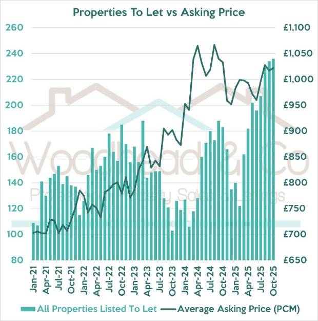 There were 236 homes available to rent in October — the highest figure since early 2023 and 29 % more than a year ago. Lettings activity slowed, with 42 homes let, down 30 % month-on-month. The average time to let remains brisk at three weeks, although it’s longer than last autumn’s record lows.